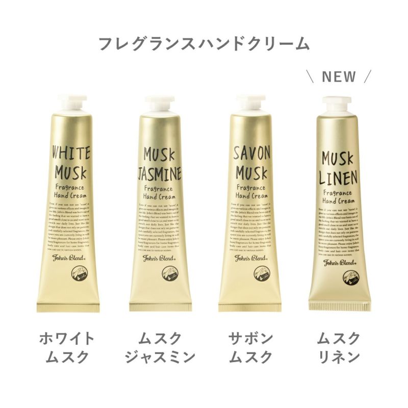 ジョンズブレンドこだわりの「ホワイトムスク」を基調とした、ほのかに甘い爽やかな香りが手肌を包み込み、塗った瞬間から心地よい気分に。 手を動かすたびに優しく香るから、気分転換にもぴったりです。