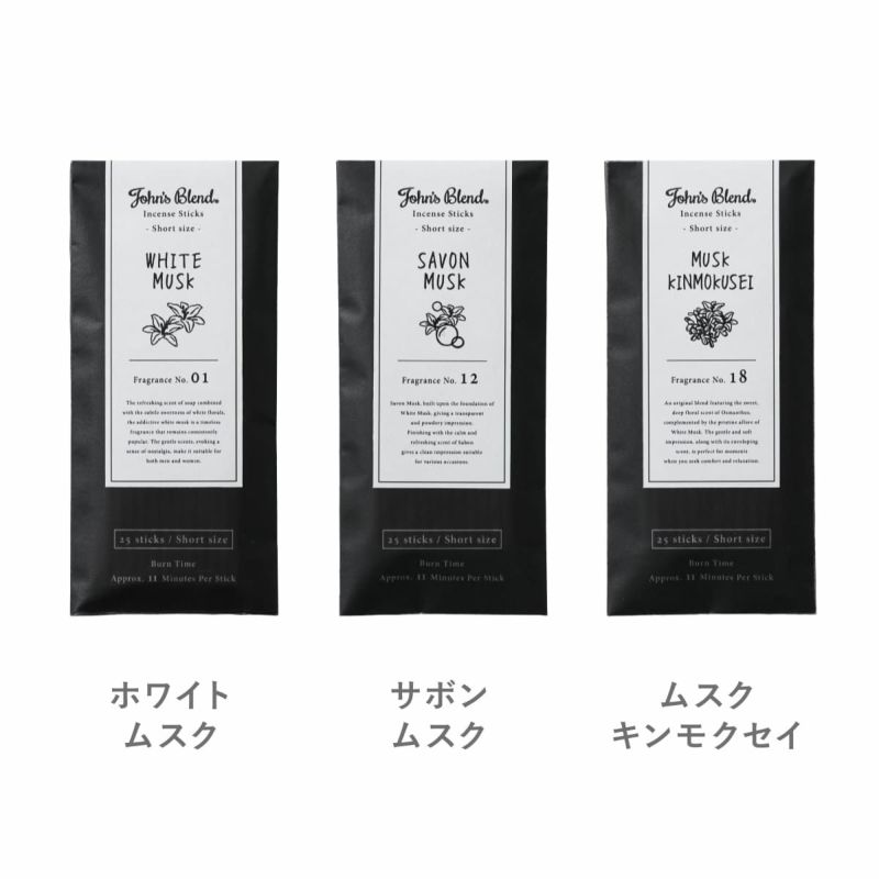 「香りと暮らそう」がコンセプトのJohn's Blend(ジョンズブレンド)がお届けするショートサイズのお香です。 1本あたり10分ほどで燃焼するから、朝の身支度や夜のリラックスタイムなど、ほんの少しの "暮らしの余白" にぴったりのサイズ感です。 光沢感のある黒を基調としたシンプルなパッケージは、インテリアにもすっと馴染むデザインで、使うたびに心まで整うような心地よさが広がります。