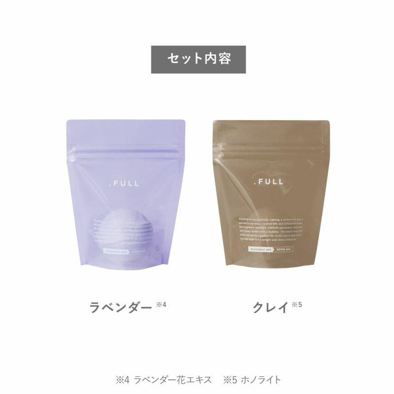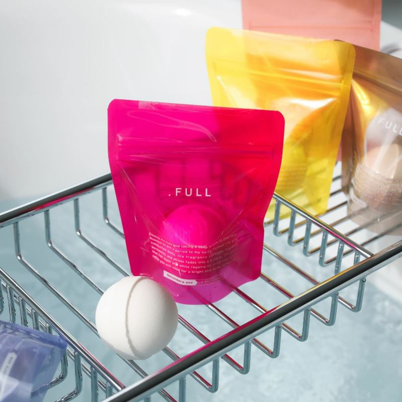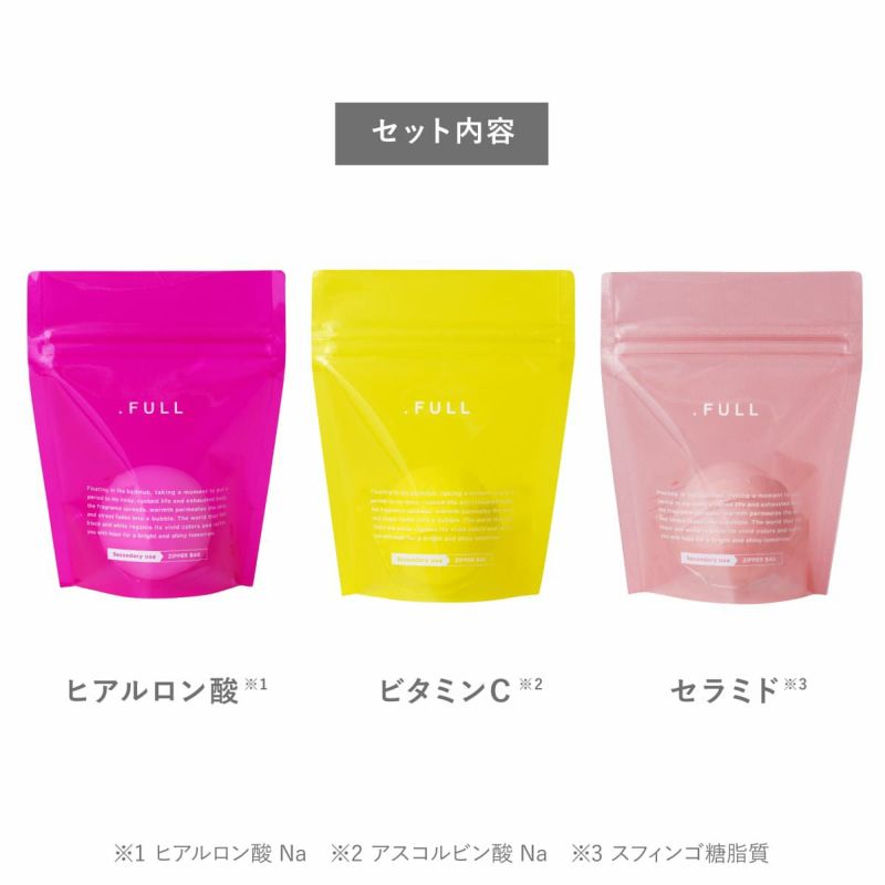 .FULL(ドットフル)のバスボムには、コメ発酵液*1と、パルミチン酸レチノール*2を配合。 角質層までうるおいを届け、しっとりとした肌触りへ導きます。 *1 コメ発酵液(保湿成分) *2 パルミチン酸レチノール(肌コンディショニング成分) さらに、その日の気分や肌の状態に合わせて選べるコンセプト成分をプラス。 お好みの香りとともに、入浴時間を心地よくお楽しみいただけます。