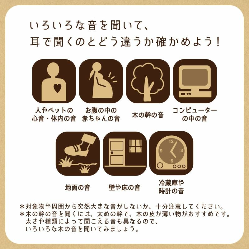 ・人やペットの心音・呼吸音 ・赤ちゃんのお腹の中の音 ・木の幹や地面の中の音 ・コンピューター内部、冷蔵庫、時計の音など 身の回りの“音”が全部、探検のフィールドに変わります。