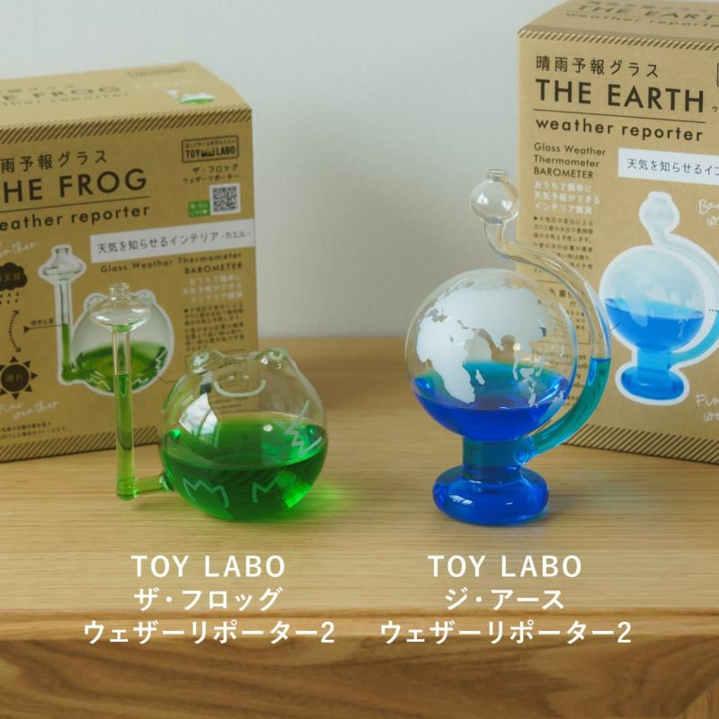 知的好奇心を刺激する 遊んで学べる科学おもちゃシリーズTOY LABO(トイラボ)ウェザーリポーターは、気圧の変化によって水面の高さが変わり、晴れや雨を予測できる楽しい知育雑貨です。 カエルや地球の形をした晴雨予報グラスに付属の液体を入れて観察すると、数時間後の天気を予報。 気分はまるで天気予報士! 大人も子どもも楽しめる、科学が学べるTOY LABOシリーズの人気アイテムです。