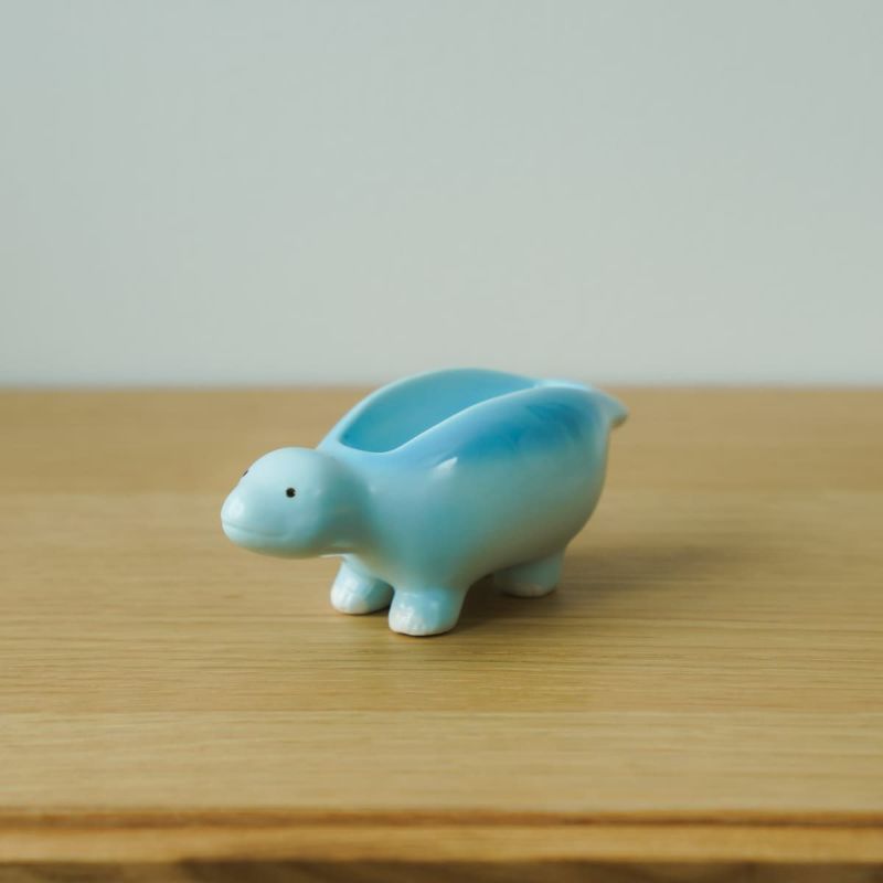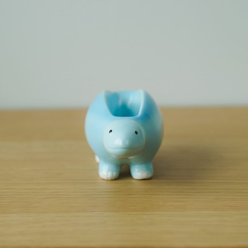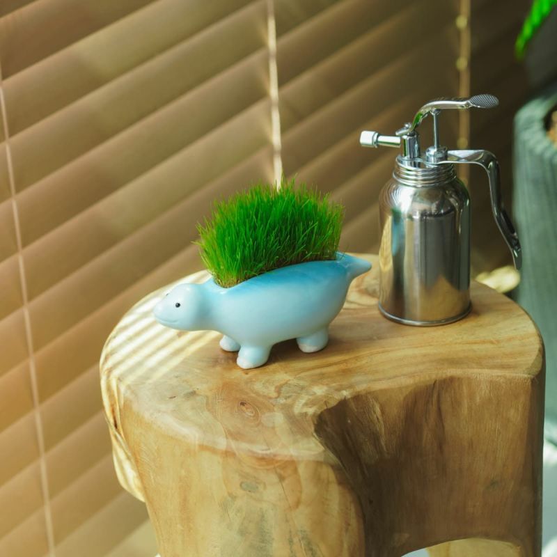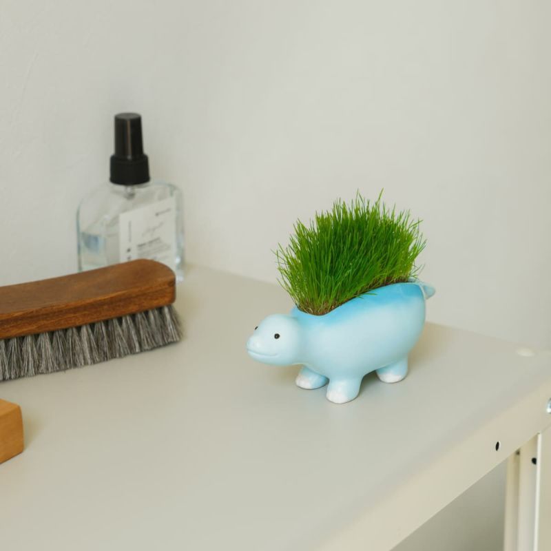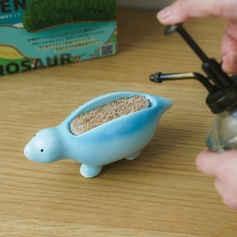 恐竜型のプランターに種をまいて、日光と水でお世話をすると、恐竜の背中にグリーンが生えてとってもかわいい姿に生長。