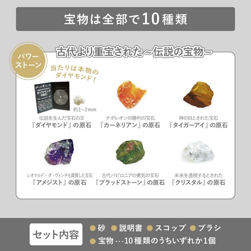伝説の宝物発見は、砂の中から10種類の伝説的な宝物のどれか一つが出てくる体験型おもちゃです。 宝石(パワーストーン)には、勇気の象徴「ブラッドストーン」や歴史的な「カーネリアン」、「タイガーアイ」など6種あり、さらにナポレオンの王冠やアーサー王の剣などのフィギュア系の宝物が4種ラインナップ。 当たりはなんと、本物の「ダイヤモンド」の原石! 発見の瞬間のワクワクが、子どもの好奇心を大きく引き出してくれますよ。