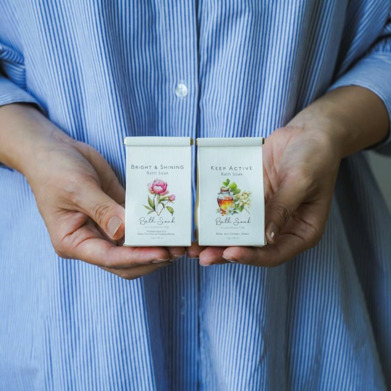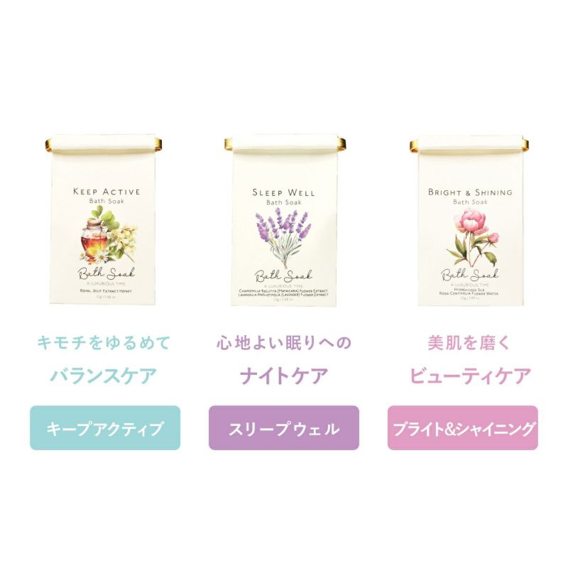 仕事や家事を終えた夜、自分自身のために使いたいケアのひととき。 「Soak」は、そんな時間を彩る入浴料として、毎日続けたくなるようなやさしい使用感に仕上げました。 お風呂の時間が、心と体を整えるひとときになりますように。