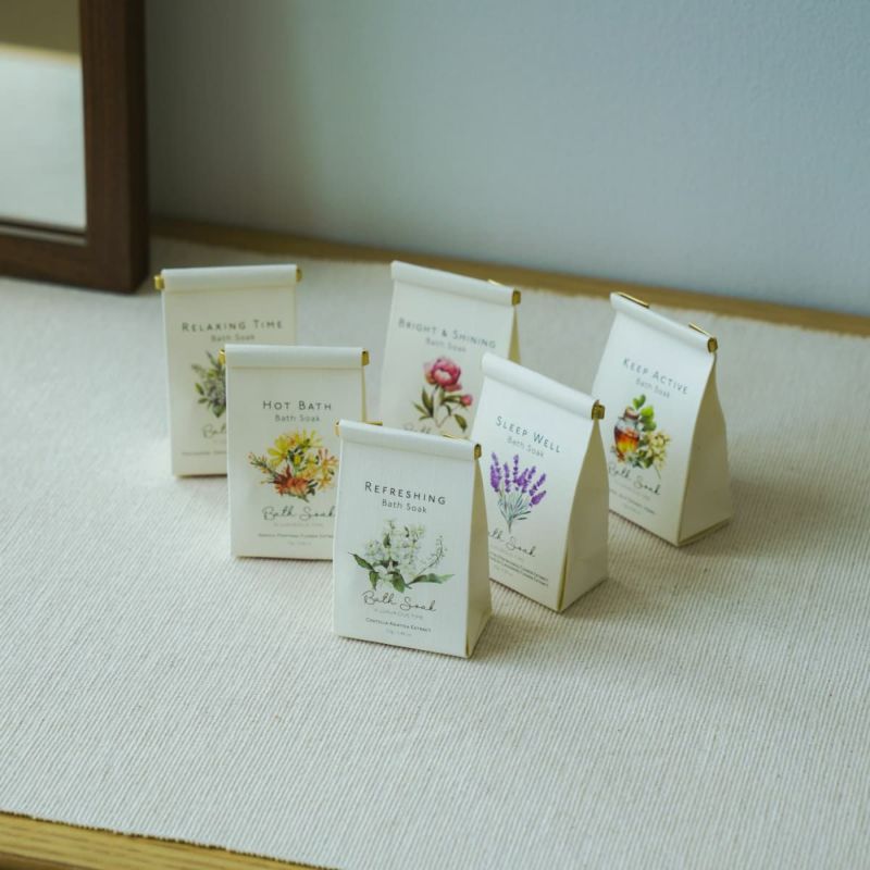 まるで小さなギフトのような、封筒型のパッケージも人気の秘密。 浴室に置いても生活感が出にくく、インテリアにもなじむナチュラルなデザイン。 「今日はどれにしよう?」そんな選ぶ時間すら楽しくなる、気分が上がるアイテムです。