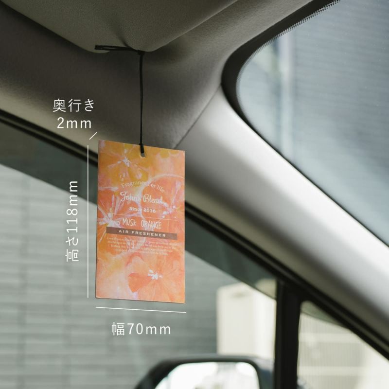 吊るすだけで簡単に香りを楽しめるJohn’s Blend(ジョンズブレンド)のエアーフレッシュナー。 車のレバーや玄関ドアノブに吊るすだけで、明るく瑞々しい香りが広がります。 明るく爽やかな「ムスクオレンジ」の香りが、空間を爽やかに演出します。