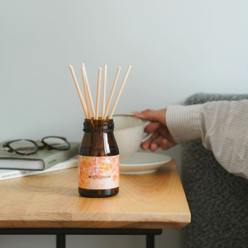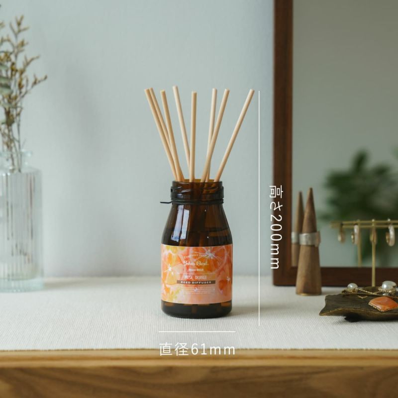 性別を問わず好まれる⼼地よいムスクオレンジの⾹りと、落ち着いたデザインが魅⼒のリードディフュー ザー。 茶⾊のガラスボトルに⿊のスティックが映え、どんな空間にも⾃然になじみます。