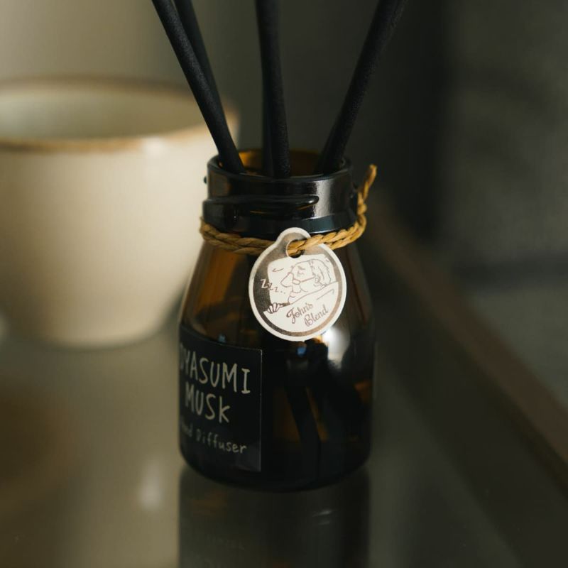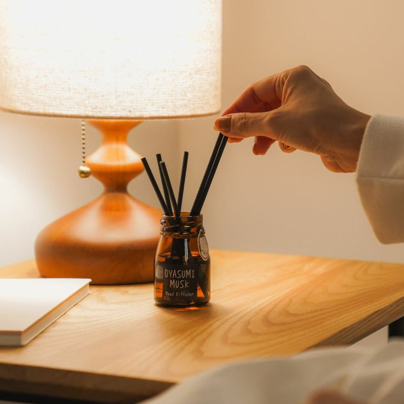 ミニサイズのディフューザーは、省スペースでも使いやすく、ベッドサイドやドレッサー、デスクなどにも置きやすいサイズ感。 どんなインテリアにもなじむから、ディフューザー初心者の方にもおすすめです。 一日の終わりに、ほのかに漂うOYASUMI MUSKが、空間を心地よく包み込みます。