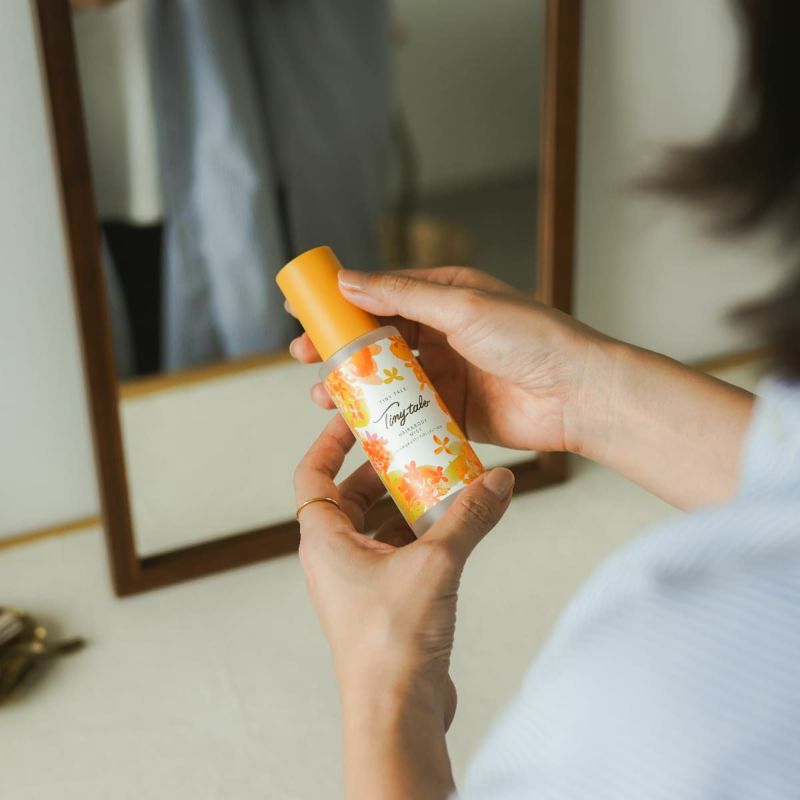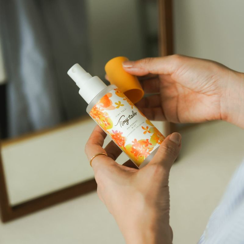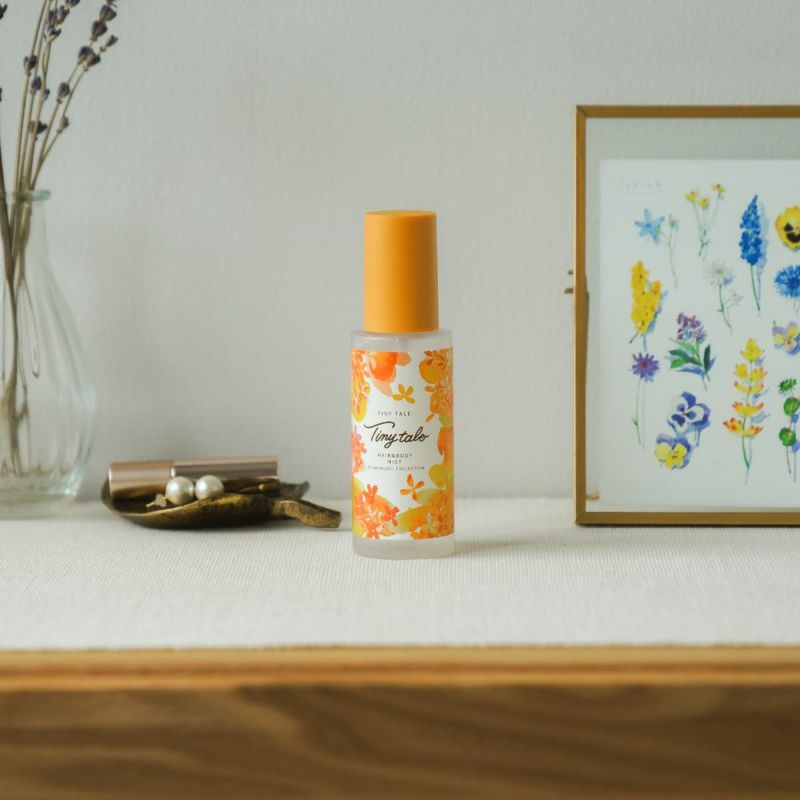 秋の風にふわりと香る金木犀(キンモクセイ)の香りをイメージした、「Tiny tale(タイニーテイル)ヘア&ボディミスト」。 保湿成分*1配合で、髪にも肌にも使える2WAYタイプのフレグランスミストです。 乾燥が気になる季節に、リフレッシュしたい瞬間に。 ひと吹きするだけで、やさしい甘さの金木犀の香りで心地よいひとときを。 香水よりもライトでしっとりなじむミストタイプだから、外出先やオフィス、デートなどシーンを問わず使いやすいのも魅力です。 *1 ヒアルロン酸Na