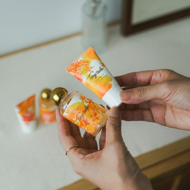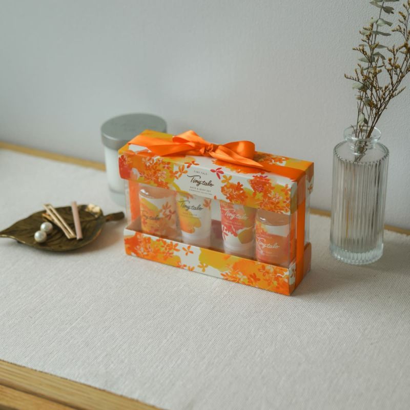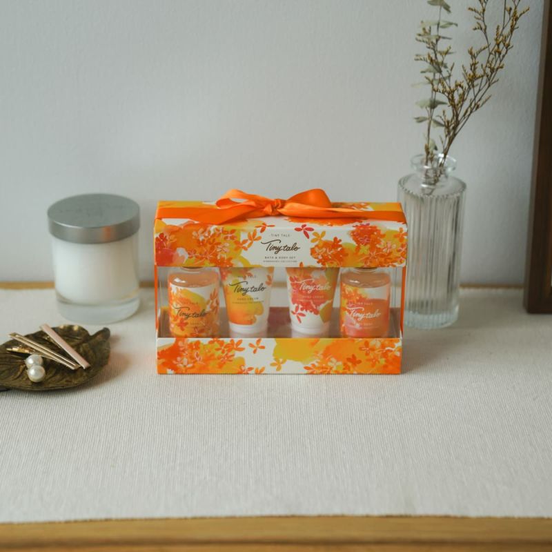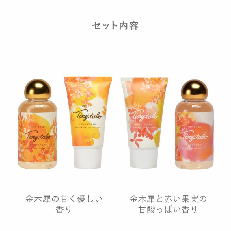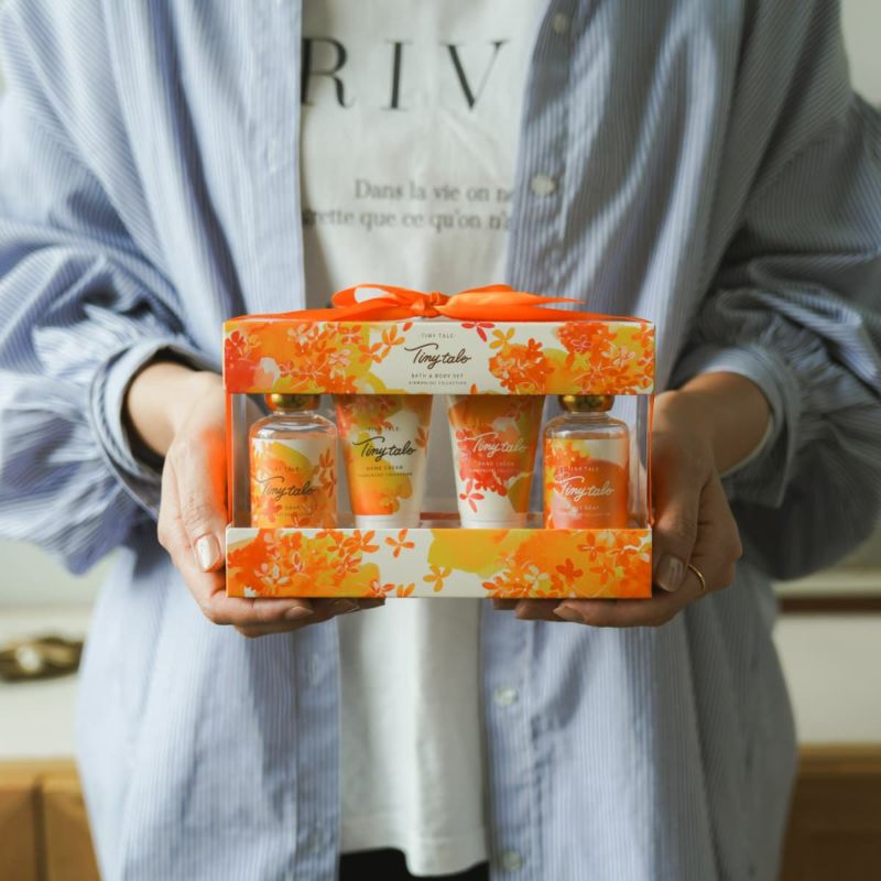やさしく広がる金木犀の香りで、毎日のケアタイムを華やかに演出。 秋らしい香りが魅力の「Tiny tale(タイニーテイル)」のバス&ボディセットは、贈り物にも、自分へのご褒美にもぴったりなアイテムです。 ハンドクリームとボディソープがそれぞれ2本ずつ入ったセットで、香りは以下の2種類。 ・金木犀の甘くやさしい香り ・金木犀と赤い果実の甘酸っぱい香り 気分やシーンに合わせて使い分けられるのも嬉しいポイント。香りの違いを楽しみながら、日々のケアに彩りをプラスできます。