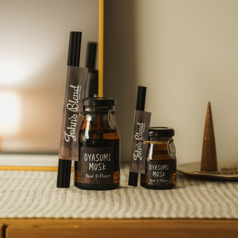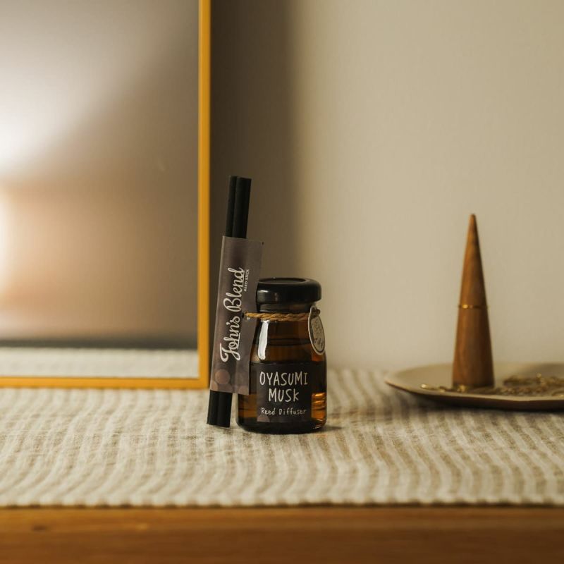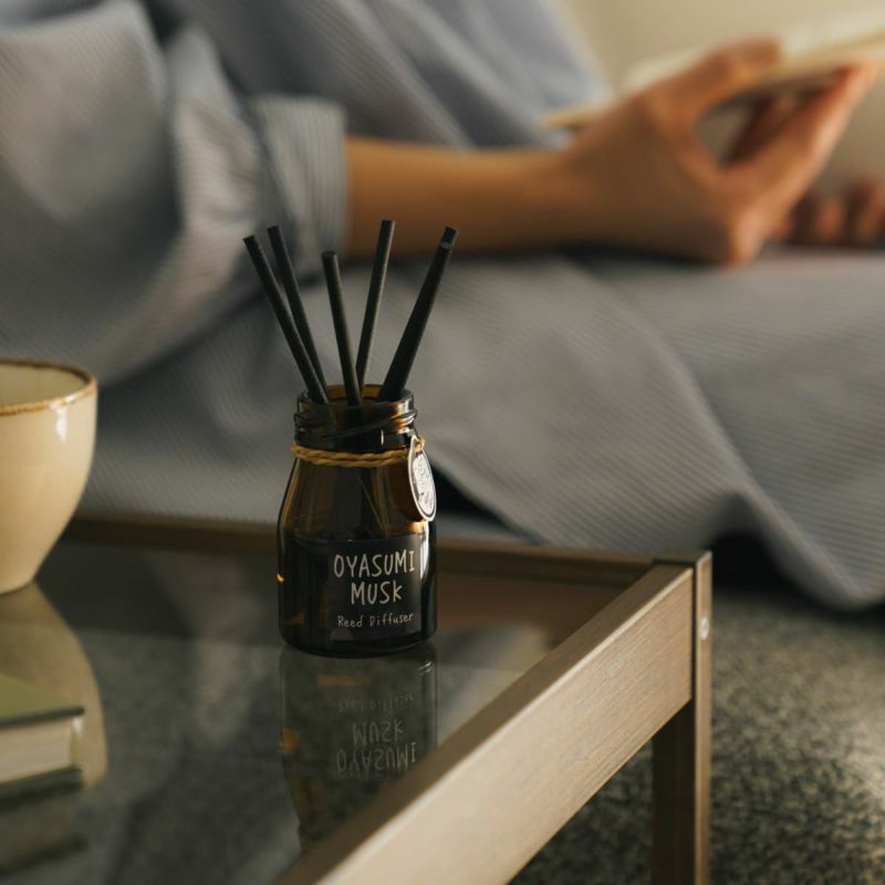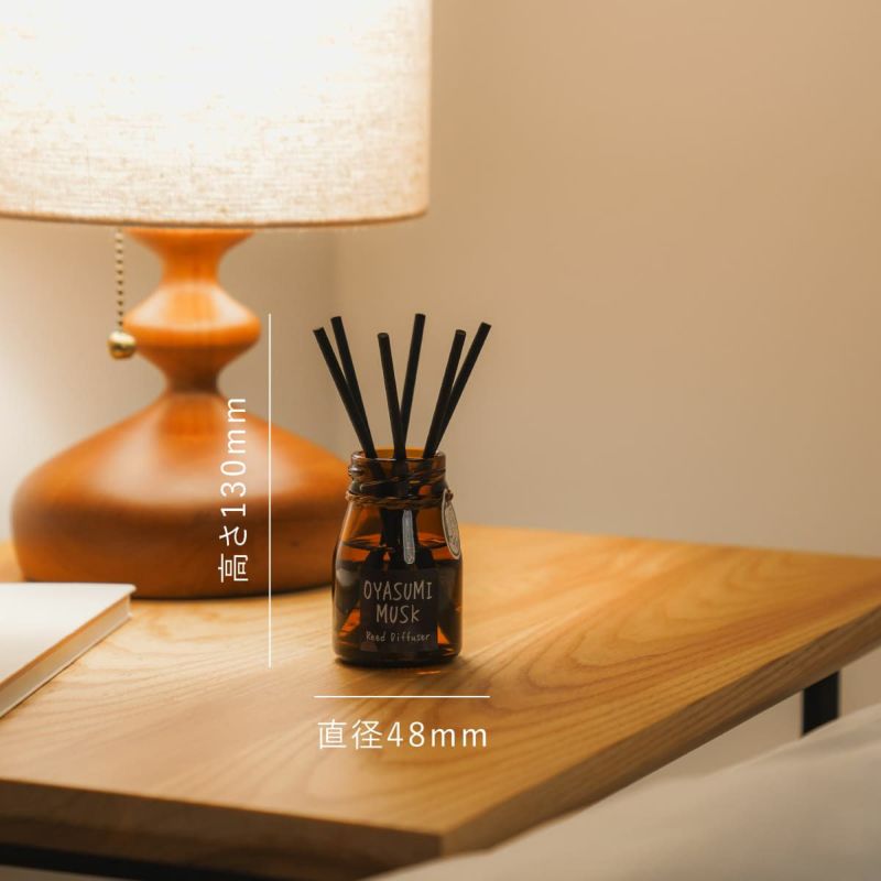 ミニサイズのディフューザーは、省スペースでも使いやすく、ベッドサイドやドレッサー、デスクなどにも置きやすいサイズ感。 どんなインテリアにもなじむから、ディフューザー初心者の方にもおすすめです。 一日の終わりに、ほのかに漂うOYASUMI MUSKが、空間を心地よく包み込みます。