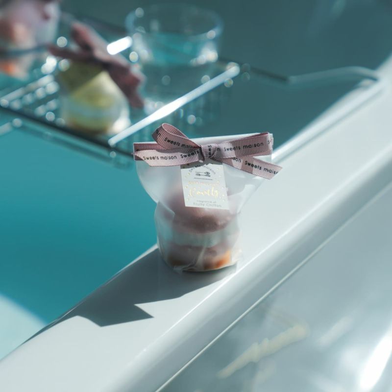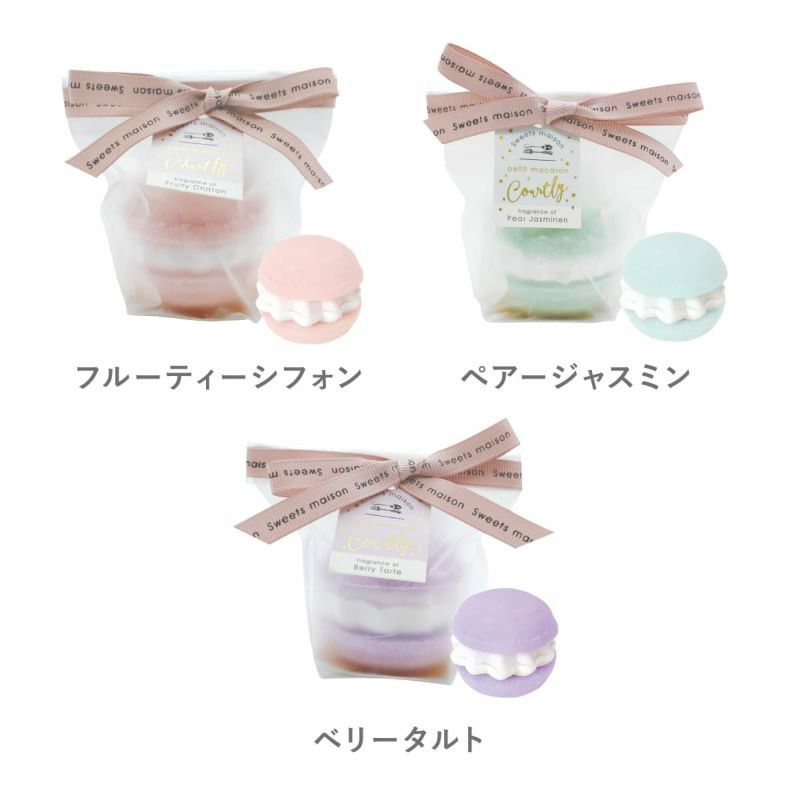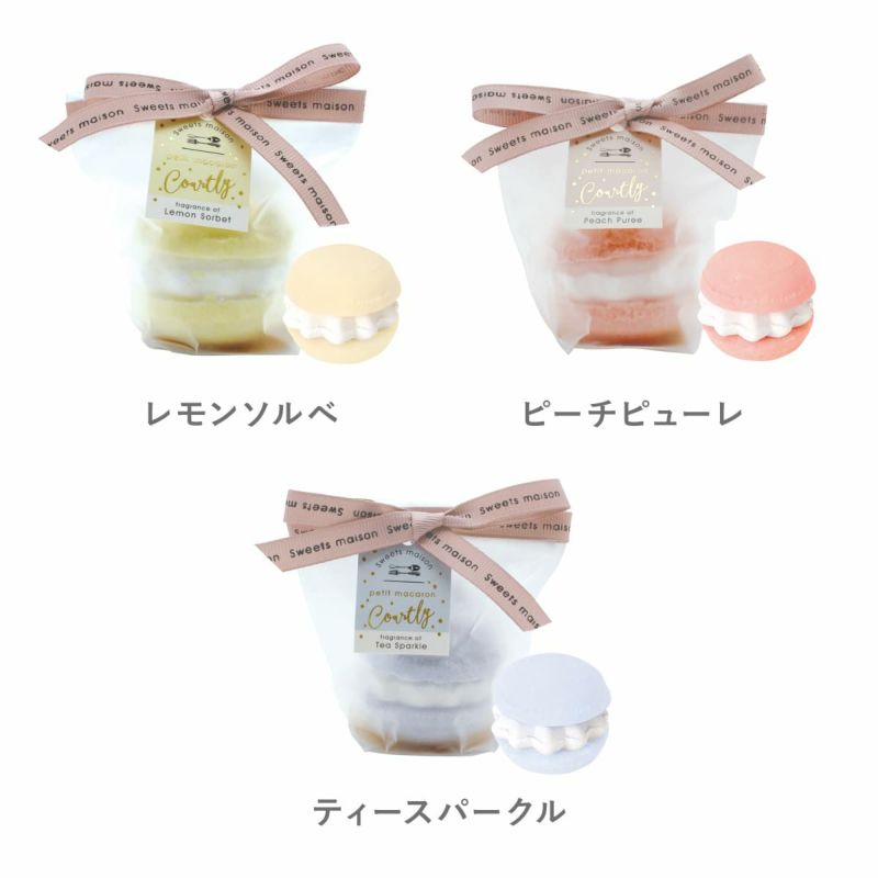 Sweets maison(スウィーツメゾン)プチマカロンフィズ コートリーは、まるで本物のマカロンのような可愛さが特徴の入浴料。 ティーの甘く爽やかな香りが広がり、癒しのひとときを提供します。 見た目だけでなく、香りや使用感も抜群です。