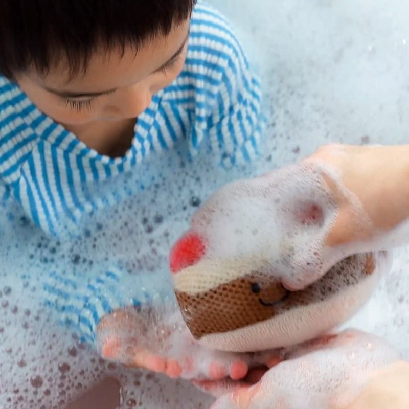 スポンジの表面はたっぷり泡立つメッシュ生地、裏面は肌に優しいパイル生地で、お子さまの肌にもやさしい使い心地です。