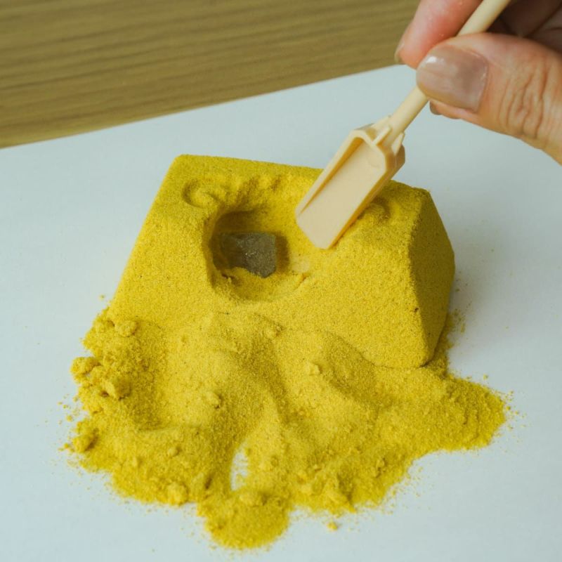 セット内容は、発掘用の砂ブロックにスコップとブラシ。開封してすぐに始められるので、プレゼントにもぴったりです。
