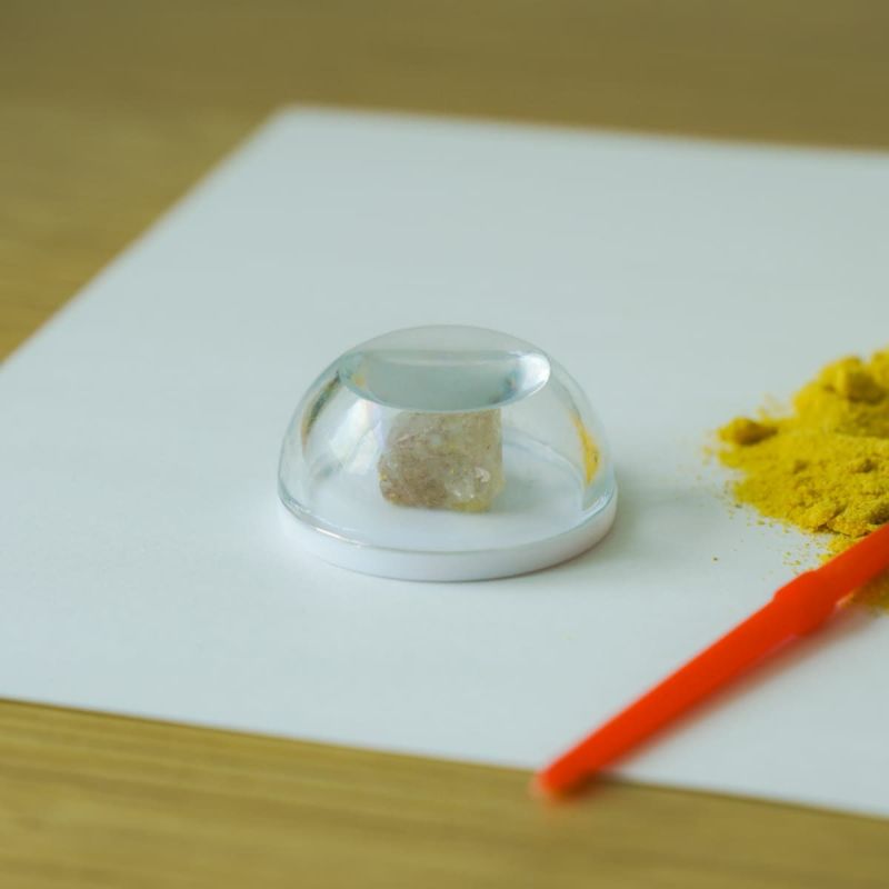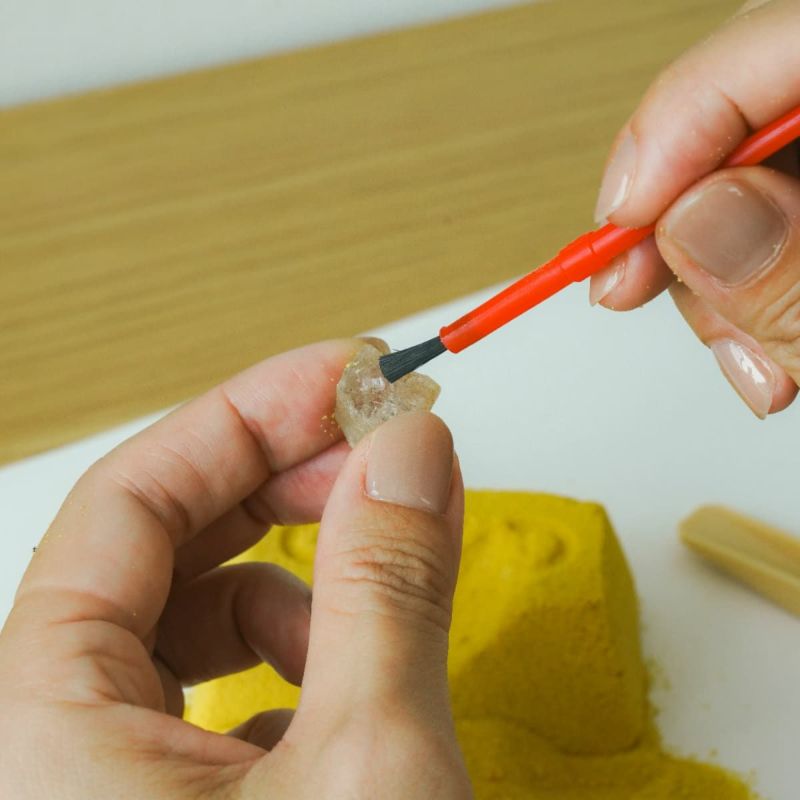 (3)細かい砂はブラシで取り除きます。掘った後の石を虫ねがね付きケースに入れてディスプレイしましょう。
