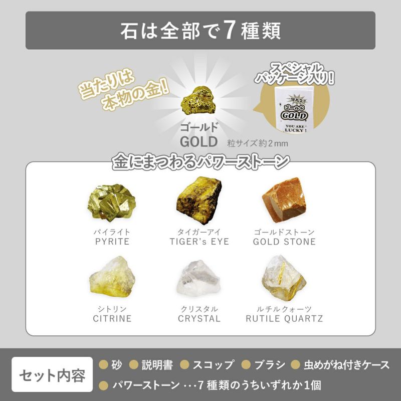 タイガーアイやゴールドストーンなど、金にまつわる7種のパワーストーンの中からどれか一つが出てきます。当たりはなんと“本物の金”!