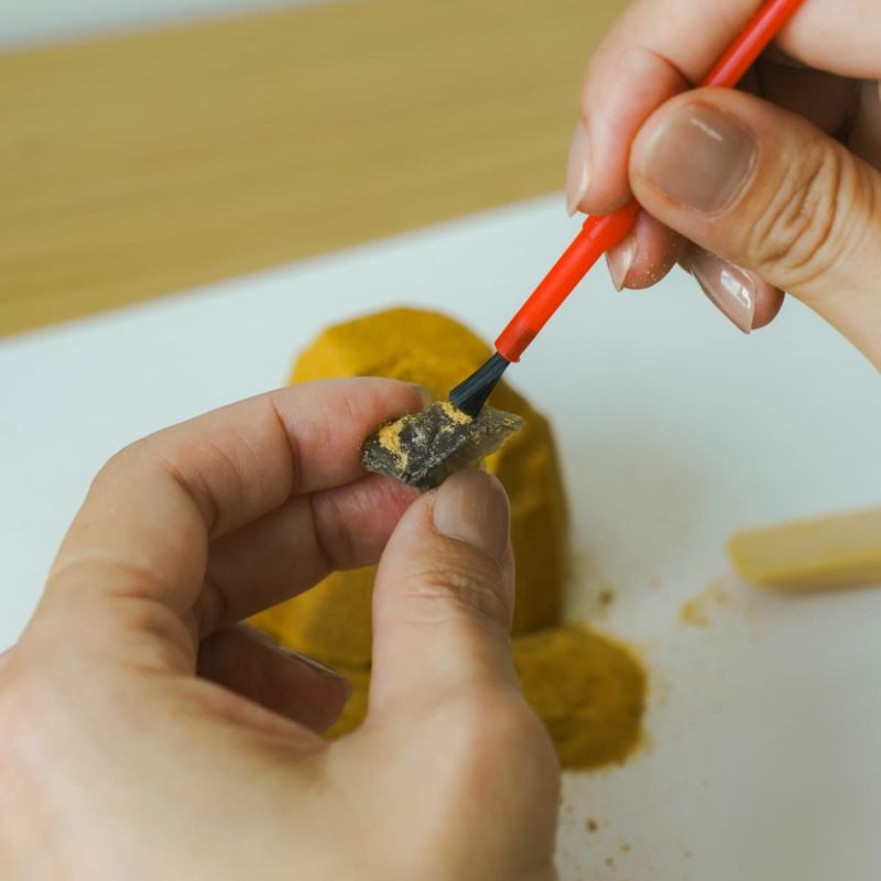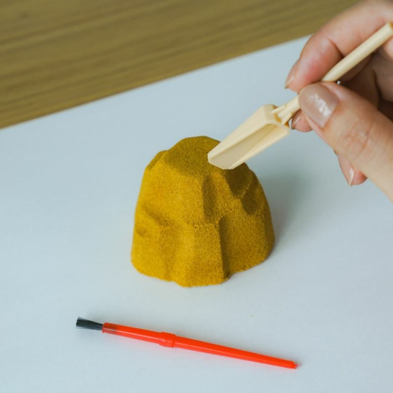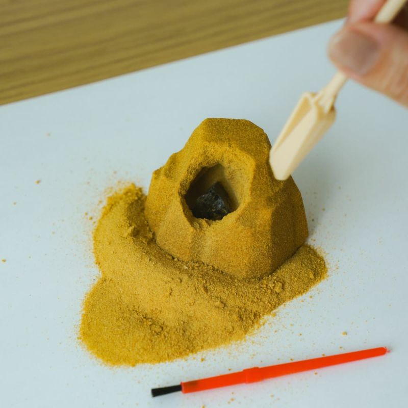 砂の中に隠れた“本物の水晶”を、付属のスティックとハケで探し出す、子どもも大人も楽しめる発掘体験キット。