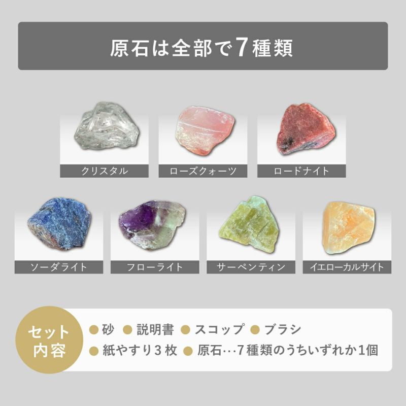 セット内容には、原石入り砂・説明書・スコップ・ブラシ・紙やすり(3枚)がすべて揃っています。