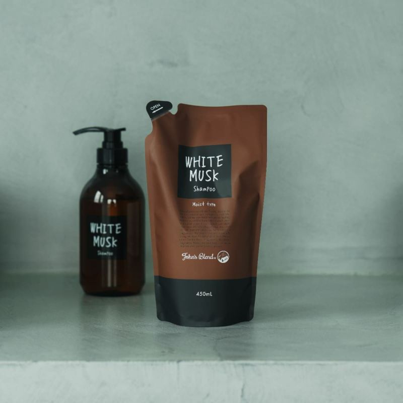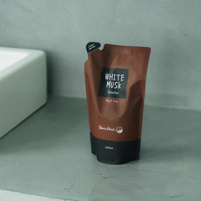 John's Blend(ジョンズブレンド)モイストシャンプーの最大の特徴は、香り立ちの良さ。 手のひらに出して泡立てると、ふわっと広がるホワイトムスクの香り。 香りをまとった濃密泡が、髪と頭皮を包み込んでやさしく洗い上げます。