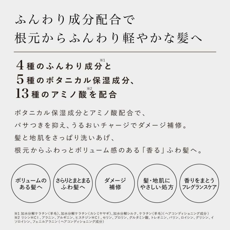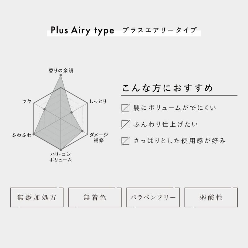 5種のボタニカル保湿成分と13種のアミノ酸*が髪のダメージを補修し、パサつきや広がりをおさえて滑らかな仕上がりに。 プラスエアリーシャンプーと合わせて使うことで、根本からふわっとボリューム感のある「香る」ふわ髪を実感出来ます。 * リシン HCl、アラニン、ヒスチジン HCl、アルギニン、セリン、プロリン、グルタミン酸、トレオニン、バリン、ロイシン、グリシン、イソロイシン、フェニルアラニン(ヘアコンディショニング成分)