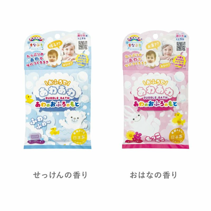 「あわのおふろのもと」は、お湯に入れると泡風呂が楽しめる入浴料。 ただ楽しいだけじゃなく、泡の膜や色の変化を観察できる知育アイテムです。 湯船に入れたらシャワーを強めに当てるだけでもこもこ泡の完成! 入浴前に仕込んでおけばお子様も大はしゃぎすること間違いなし。