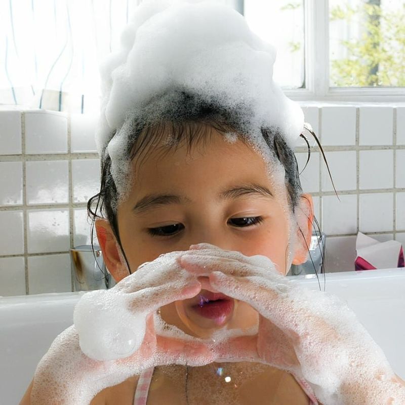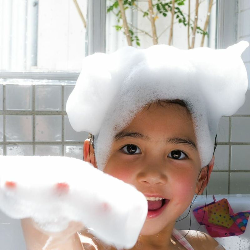 この入浴料を使えば、お風呂の時間がいつもより楽しいひとときに。 手で泡をすくってみたり、泡の中に指を入れてみたり、膜の厚さを観察したり…。 しっかり泡立てたら、頭やあごにくっつけて遊んでみよう! 泡ならではの触感や見た目の変化を楽しみながら、自然と学びの機会を得られます。 「お風呂イヤ!」と言っていたお子さまも、これならきっと入りたくなるはず!