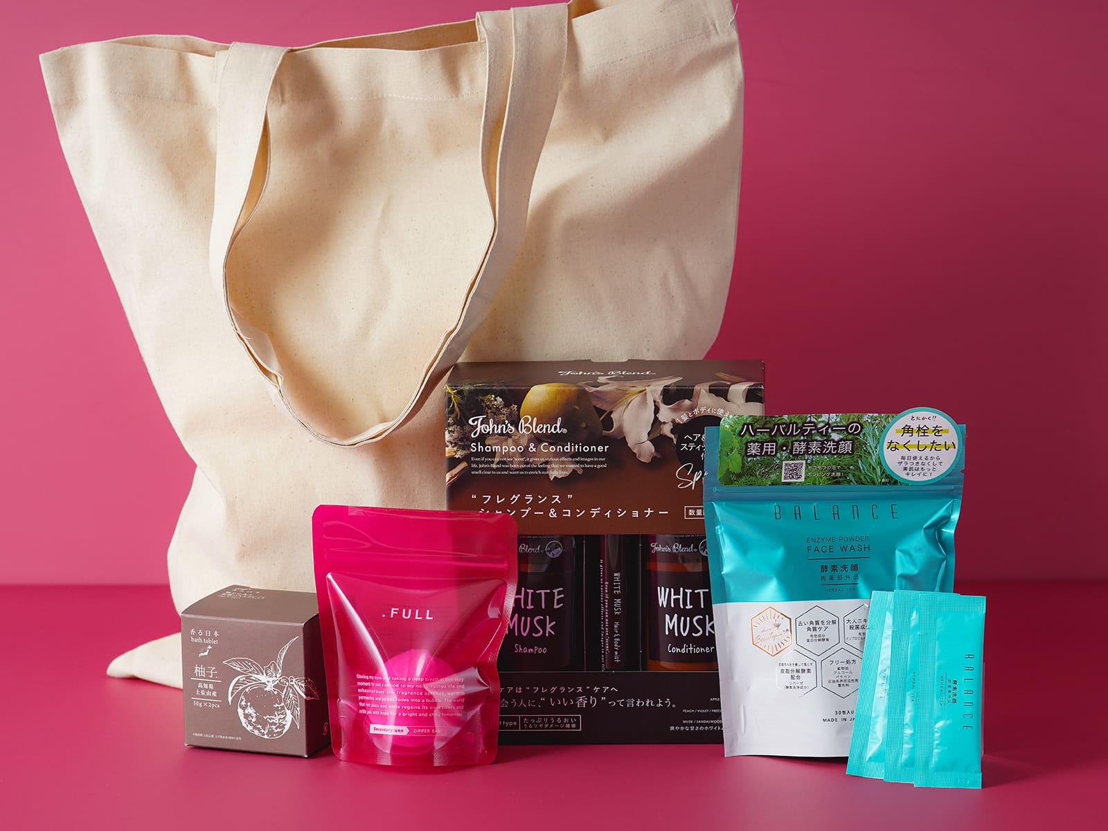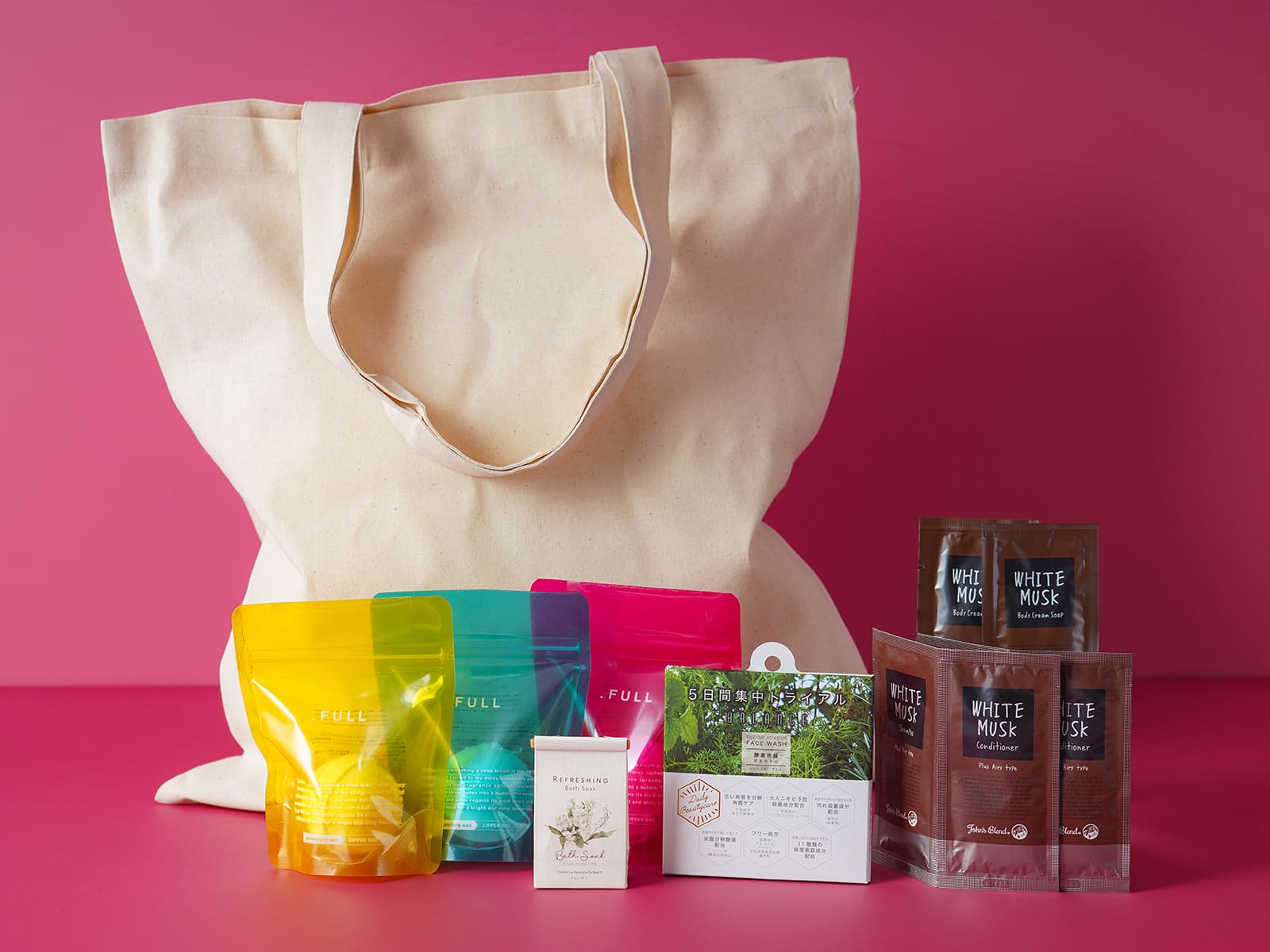 香りを楽しめる炭酸バスボム(3種)やバスタブレット、肌をやさしく洗い上げる酵素洗顔、パウチタイプのシャンプー&コンディショナーとボディーソープの5点。